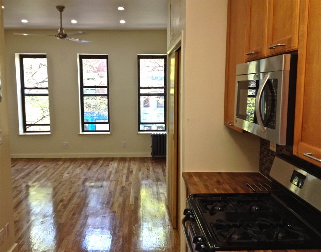 Large Sun Filled Studio with Sleeping Alcove and Skylights! Very high ceilings, exposed brick, recessed lighting, hardwood floors stainless steel appliances. Maple cabinets and butcher block countertops. Marble bathroom has skylight! Everything in this apartment is brand new! Must See! Ready May 1st.