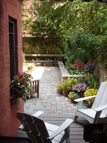 Won national landscape award for arrangement of gray cobblestone type pavers. Towering Birch trees, provide color and privacy. Raised and side strip planters, hose outlet, dramatic up spot lights, exterior electrical outlets, vintage style dimmable wall lights, unique long L-shaped benches, vibrant black and white striped retractable awning, Boston ivy vines, and indigenous plants complete this wonderful garden!
