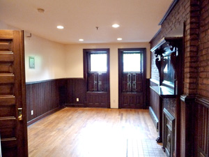 This huge 1-bdrm/1.5-bath garden floor-thru features a living/dining room with a original oak wainscotting, window pocket shutters,carved fireplace mantle, exposed brick, galley kitchen with microwave,hardwood and tile floors, Victorian detailing and—the piece de resistance in NYC—exclusive access to the backyard garden.