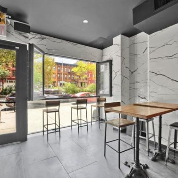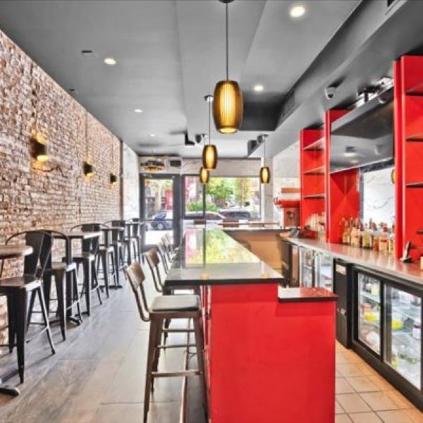 The newly built granite bar, which is the hub of the restaurant is accented with beautiful barrel cascading pendent lighting. Other features include; garage door style windows, decorative brick and tile walls with 3 built-in wine showcase displays, and tile floors throughout.