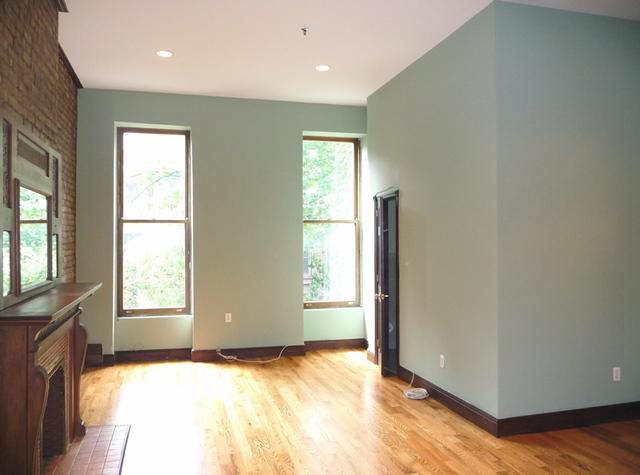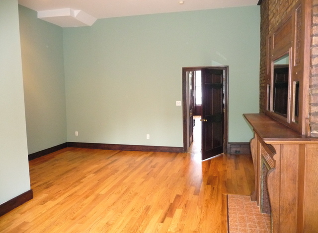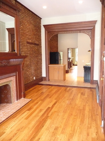 This parlour floor 1-bdrm/1.5-bath floor-thru is flooded with natural light and features a living/dining room with a gorgeous, original carved fireplace mantle, an eat-in galley kitchen with microwave, stainless appliances, hardwood and tile floors, high ceilings and Victorian detailing. The huge, quiet alcove master bedroom with ensuite bath also has an ornate carved mantle and 8' windows with warm south light in the afternoon.