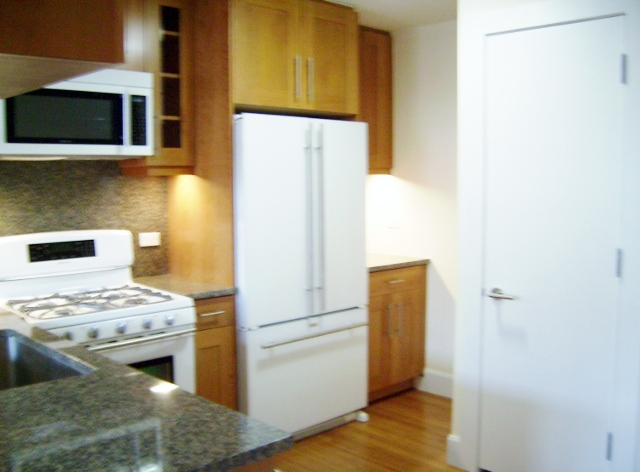 The gourmet kitchen features bamboo floors, a Jenair Floating Glass side by side refrigerator, stove, dishwasher and stainless steel hood. This apartment also has a pantry closet, washer and dryer, and a microwave.