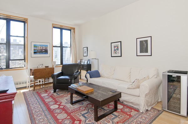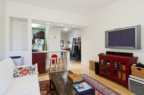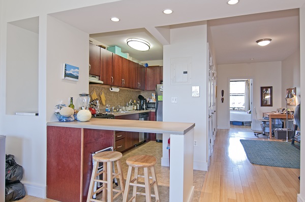 Apartment amenities include a modern kitchen (gas included in monthly rent) with dishwasher, hardwood floors, and washer and dryer. It also features an alcove area suitable for dining or a small office.