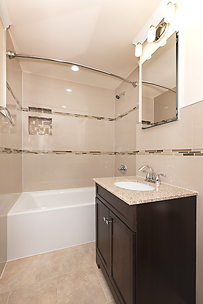 The full-width master bedroom can easily accommodate a king sized bed with night stands and furniture. Two large closets. Master bath features a deep soaking tub, stone tile accents, and granite countertop vanity with medicine cabinet.
