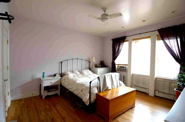 Spread out in this 2nd floor, 2 bdrm, 730 sf floor-thru apartment. The 15’ x 15’ master bedroom features two closets and three arched windows. An exposed brick wall adds a touch of modern to the large classic central living room with a pass-thru to the cozy and efficient kitchen. The smaller 2nd bdrm, full of south light, makes a perfect home office. Hardwood floors and high ceilings throughout.