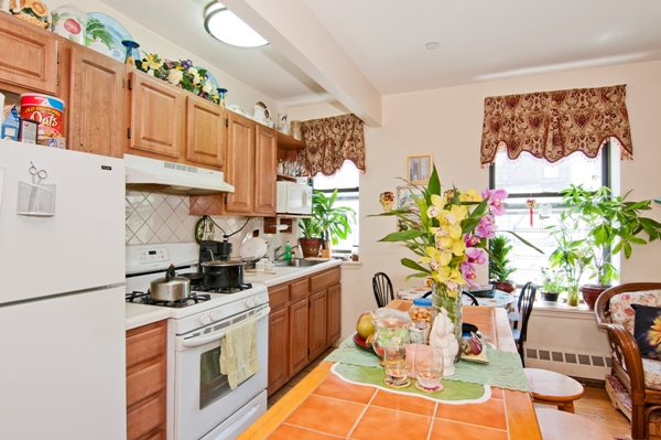 The apartment features hardwood floors, high ceilings, and a custom breakfast island in the kitchen. New oak kitchen cabinets and appliances.