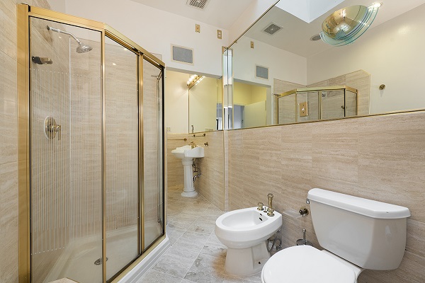 Master bathroom features a bidet, custom marble tiles, and a large linen closet.