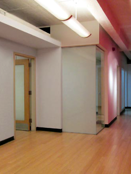 This open, fourth floor space includes a reception area, nine fully wired offices, two open office spaces, conference room, kitchenette, break room, a/v room, and plenty of storage space.