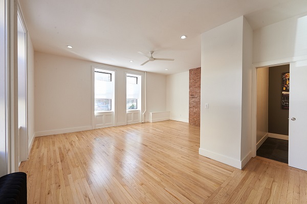 Suite 1E features an updated open layout with hardwood floors, lots of natural light from four corner windows and 10’ high ceilings. Overhead lighting is recessed with ceiling fan.