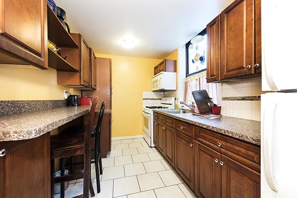 Bedrooms boast elegant plaster walls, fluted 12 Ft tray ceilings, large picture windows and cherry wood bas-relief carved fireplaces adding whimsical elegance. Brand new powder room has an original door and elegant subway tiles, with metallic glass mosaic inlays. The master bedroom has an attached bath with a classic claw-foot tub and original fireplace.