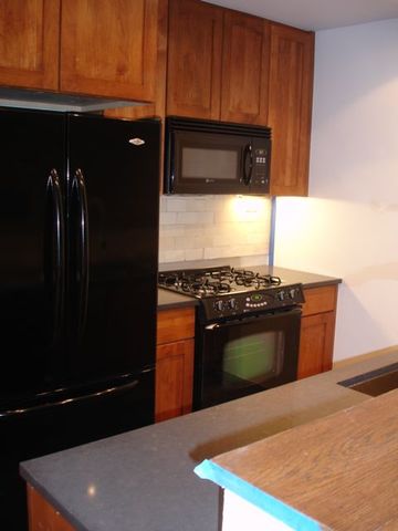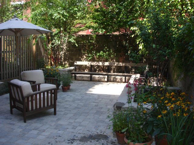 Won national landscape award for arrangement of gray cobblestone type pavers. Towering Birch trees, provide color and privacy. Raised and side strip planters, hose outlet, dramatic up spot lights, exterior electrical outlets, vintage style dimmable wall lights, unique long L-shaped benches, vibrant black and white striped retractable awning, Boston ivy vines, and indigenous plants complete this wonderful garden!