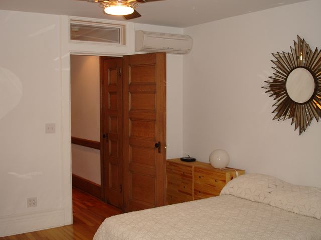 Huge private quiet room with original wood floors Sliding double-paned glass doors open out to beautifully landscaped private garden and mature trees. Custom electronic exterior retractable steel gate and modern ceiling mounted luminous curtain provides security and privacy.