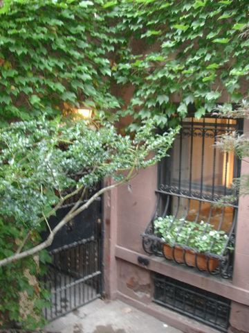 Lush Boston Ivy, Japanese Maple, Boxwood Hedges and Honey Locust exquisitely frame the private entrance. Wisteria gently billows on forged ironwork fencing.