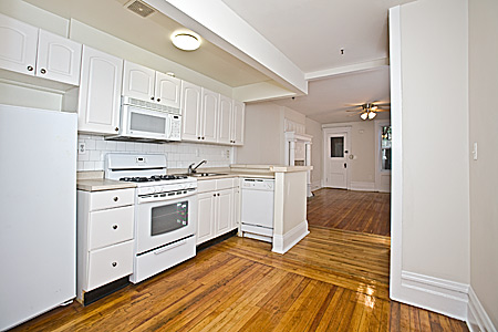 Private Garden Apartment with fountain centerpiece. Interior is completely renovated and features, decorative original fireplace, 9" mouldings, french doors leading to the bedroom, hardwood floors, recessed lighting, and gourmet kitchen. Large windows facing the front of the building give this apartment a light airy feel. Bathroom features subway tile floors and surrounds, high end pedistal sink and washer dryer.