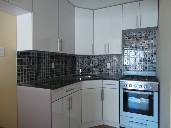 The kitchen features brand new stainless steel appliances, white lacquered cabinets, and granite countertops.