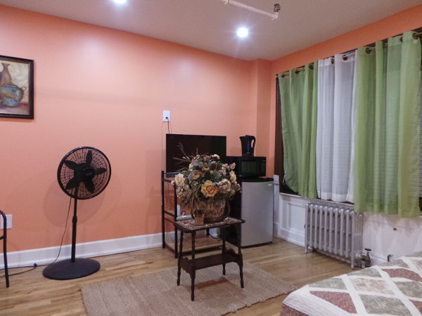 Large renovated furnished room for rent. Tastefully decorated. Features private bathroom. It does not have a kitchen. No cooking. Has hotplate and refrigerator.