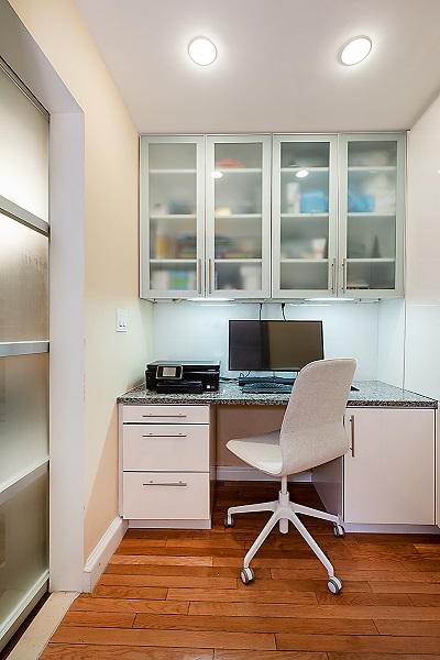 It features a separate kitchen, sleeping alcove, a small office area, large Elfa walk-in closet, and designer bathroom with Toto toilet, and NK Porcelanosa bathroom fixtures.