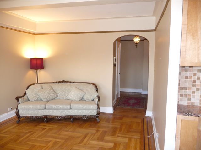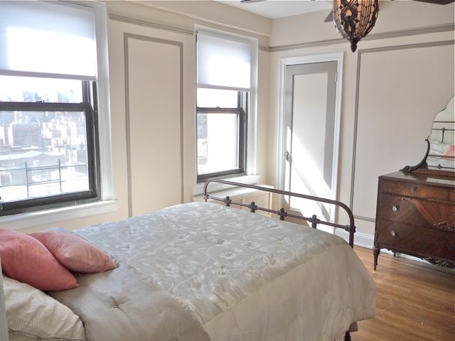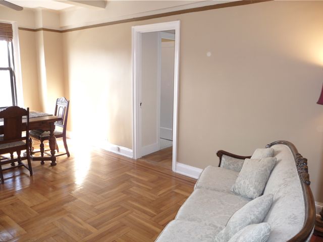 The comfortable living area with herringbone oak floors and mahogany inlays shares a short hallway that leads to the huge bedroom. Wonderful southern exposure drenches the whole apartment in warm sunlight and unobstructed city views from windows in all the rooms--even the bathroom.