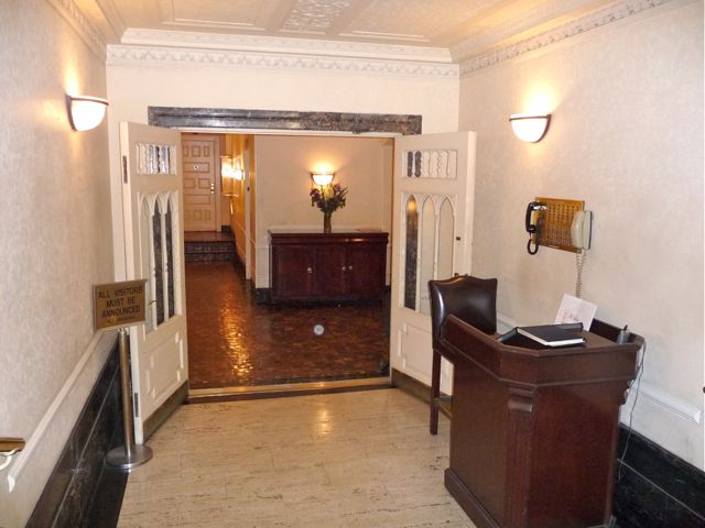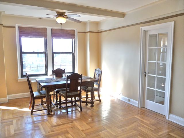 The recently renovated Apt 12D features an open, gourmet kitchen with maple Shaker-style cabinets, granite counters, a smooth cork floor, stainless appliances, double oven, and even a water filtration system. This efficient workspace compliments the nearby dining/living area. Tiffany-style crystal lighting and ceiling fans add grace to this beautiful home!