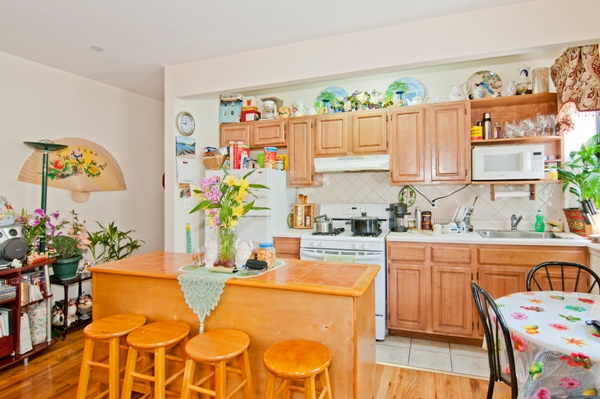 The apartment features hardwood floors, high ceilings, and a custom breakfast island in the kitchen. New oak kitchen cabinets and appliances.