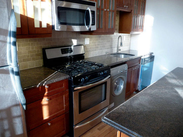 The large 205 sf dining/kitchen features tons of cabinets, granite counter, stainless appliances, dishwasher, washer/dryer combo, microwave–-and a very convenient granite-topped floating island. The 288 sf bedroom/living room has two large windows overlooking ACP Blvd, a huge 42 sf walk-in closet, ceiling fan and central AC!