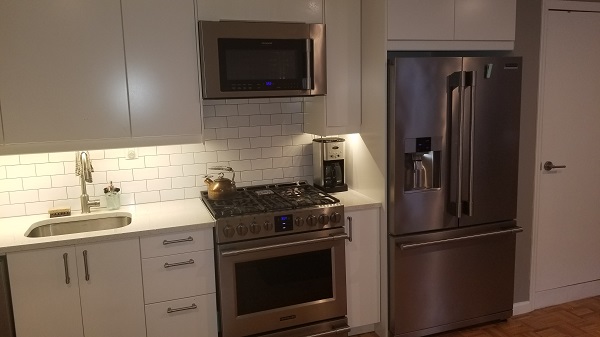 Gourmet kitchen has stainless steel professional grade stove, french door refrigerator, dishwasher, and microwave. White lacquer cabinets with under mount lighting, deep stainless steel sink and goose neck vegetable sprayer.