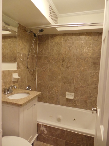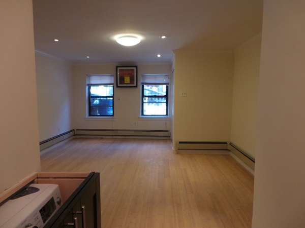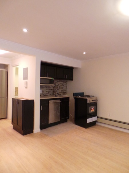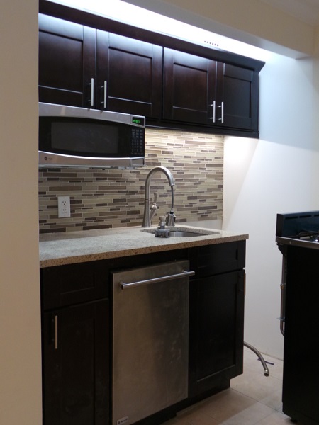 This very quiet beautifully renovated ground floor studio apartment has an alcove kitchen with walnut cabinets, glass tiled backsplash, and granite counter tops.